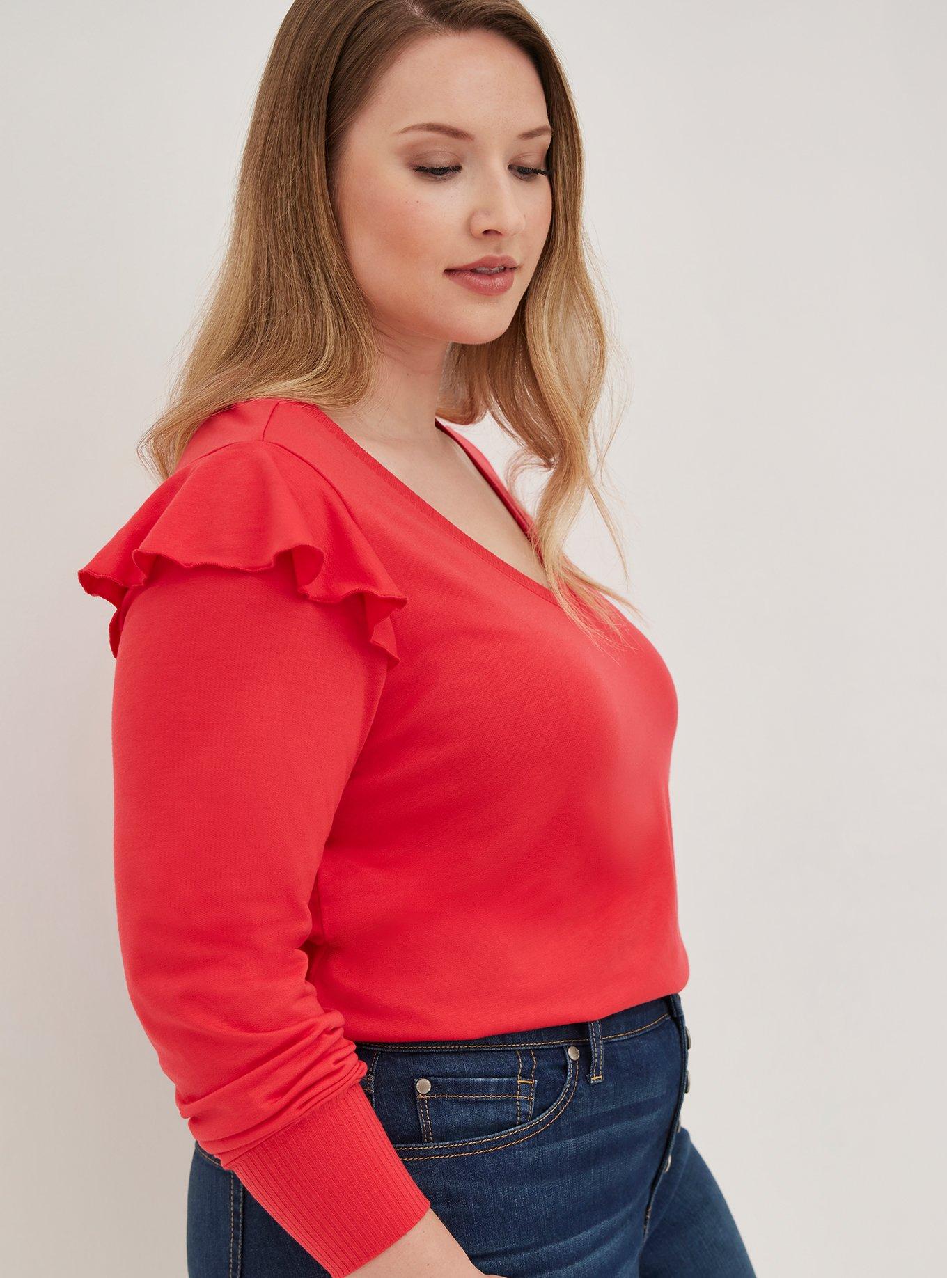 Plus Size Lt Weight French Terry V Neck Ruffle Shoulder Very well made.